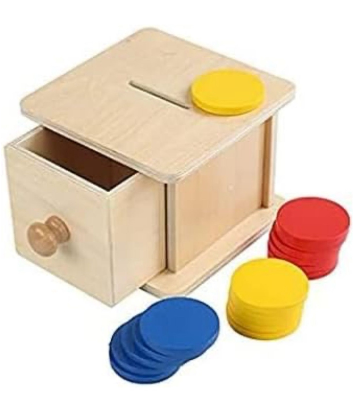 A Montessori essential. Kids drop coins into the slot, watch them disappear, and slide open the drawer to retrieve — building memory and patience.